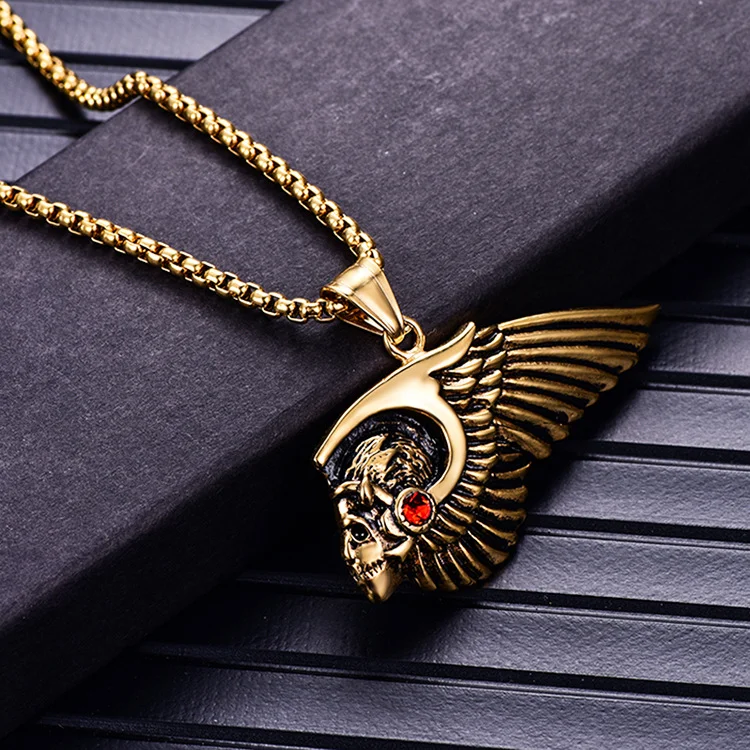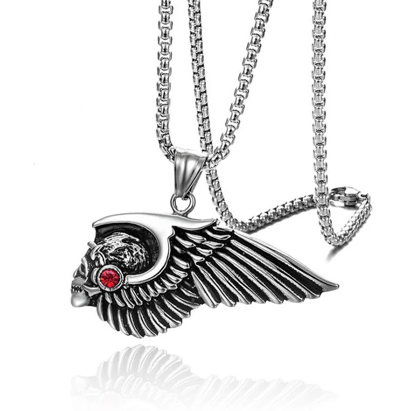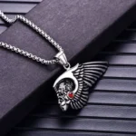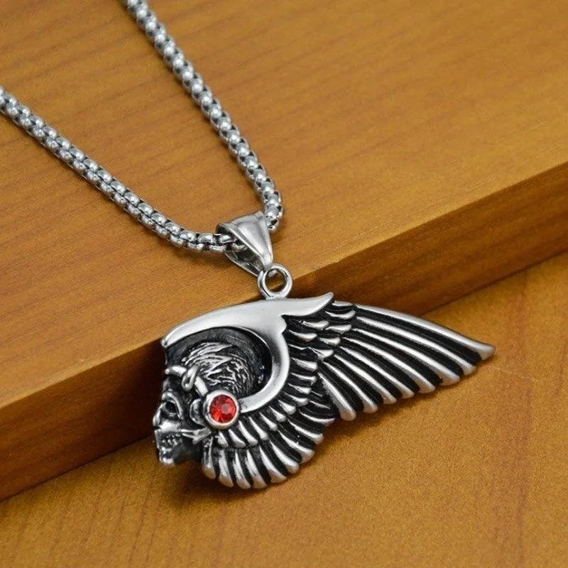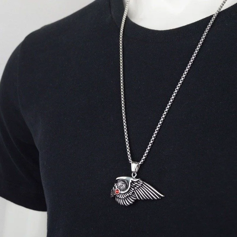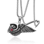 Crafted for the fearless spirit of the road, this titanium pendant embodies the bold essence of brotherhood and rebellion. Measuring 30mm by 54mm, the detailed winged-skull design with a fiery red accent resonates with the pride and loyalty of every Hells Angels member. Available in rugged silver or striking gold finishes, it comes with a durable 60cm chain—built tough for those who ride hard and live free.
